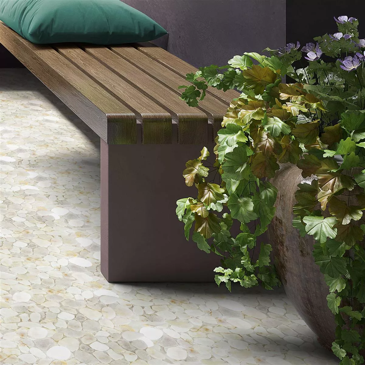 Disse natursteinsflisene er egnet for innendørs og våte områder så vel som utendørs takket være deres frostbestandighet. Gi rommene dine et naturlig og harmonisk preg med elvesteinmosaikk-natursteinfliser Riva White og design dem i henhold til dine individuelle ideer.