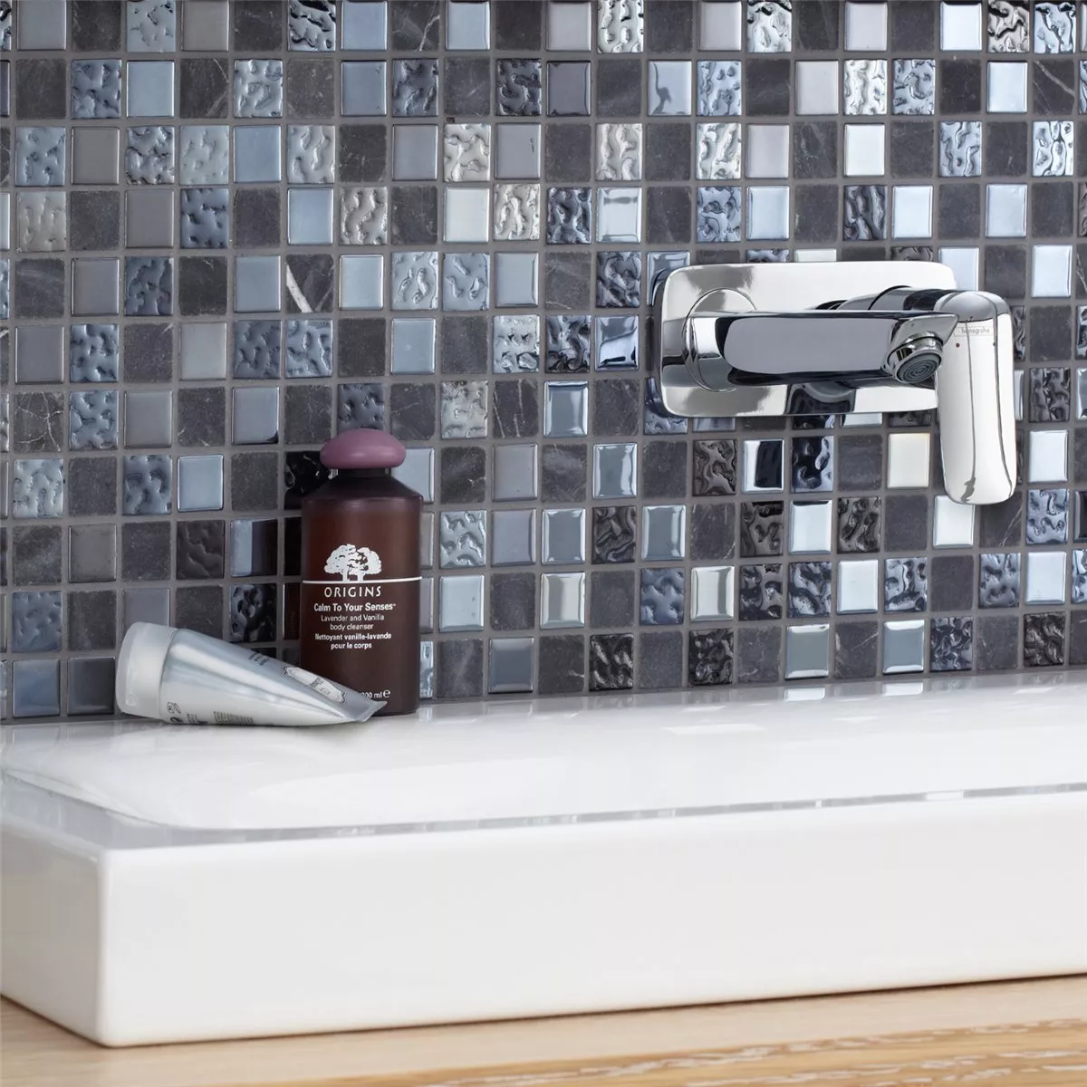 Epsilon mosaikkflis kombinerer de elegante fargene svart og grått med en variert blanding av matte og blanke overflater. Deres høykvalitetsmateriale laget av naturstein, glass og marmor gir rommene et eksklusivt og moderne utseende.