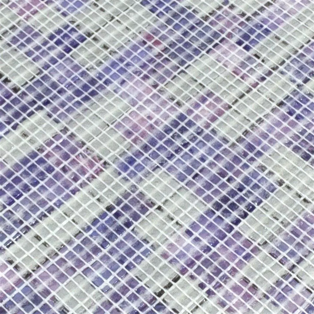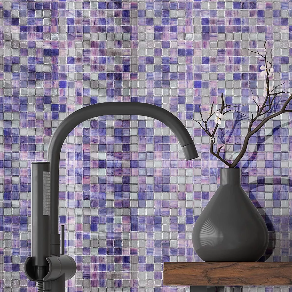 Edessa glassmosaikkfliser i en fortryllende lilla blanding, inkludert lavendelnyanser, gir rommene et elegant og moderne utseende.