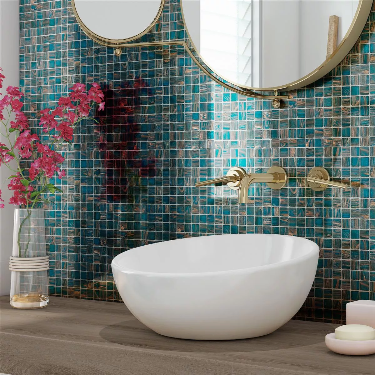 Perfekt for bad, kjøkken, innendørs områder og dusjer, disse allsidige flisene er spesielt designet for våte områder. Gi rommet ditt en rolig, men likevel imponerende fargekombinasjon med Kyoto Petrol Blue glassmosaikkfliser.