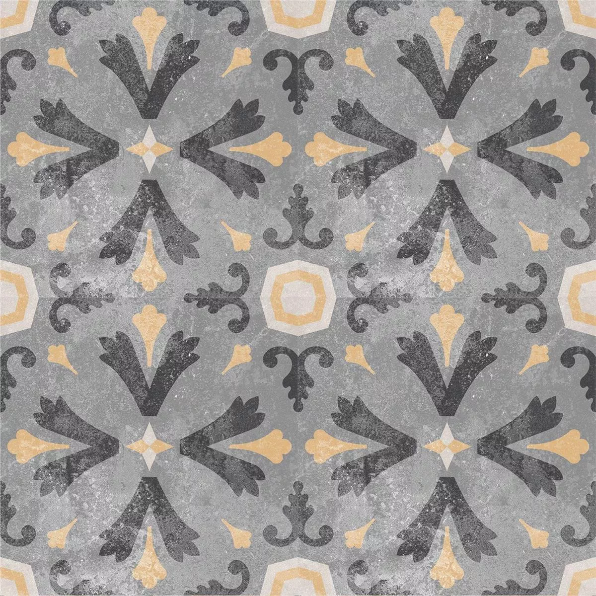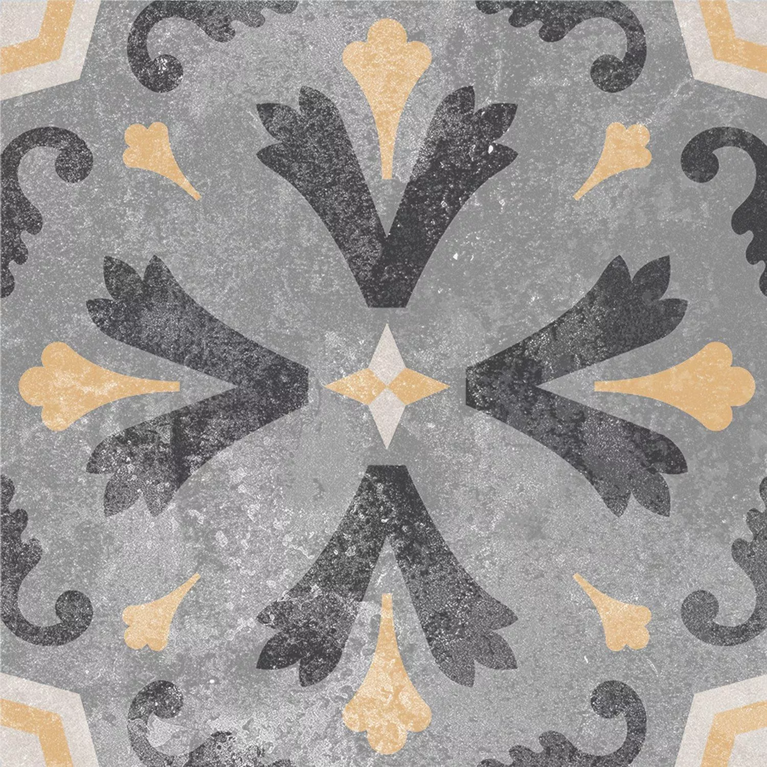 Sementflisene på 18,6 x 18,6 cm i retrolook har svarte blomsterdekorasjoner på en mørkegrå bakgrunn. Sementflisene egner seg for gulvvarme, glasert, matt og 11mm.