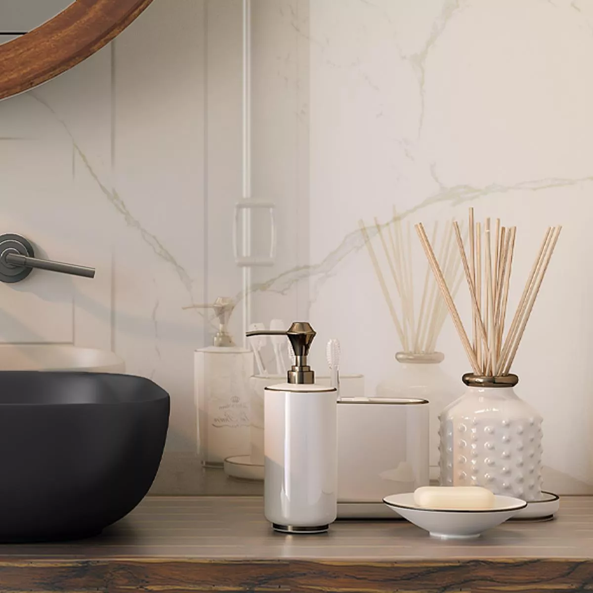 Ampezzo Calacatta-flisene kombinerer den tidløse skjønnheten til marmor med de praktiske fordelene til moderne keramikk. Deres polerte, skinnende overflate reflekterer lys og får rommene til å virke større og lysere. Det hvit-beige fargevalget med de karakteristiske marmorårene skaper en varm og innbydende atmosfære.