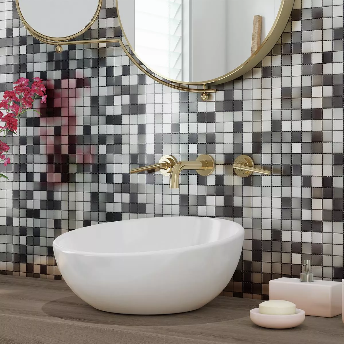 Galleria keramiske mosaikkfliser i den stilige sort-grå-hvit fargekombinasjonen gir et moderne preg til ethvert rom med sitt moderne metallutseende og matte overflate. Med steinstørrelsen 23 x 23 mm og flisematten på 29,7 x 29,7 cm, som allerede er limt på et nett klart for montering, er monteringen på både vegger og gulv spesielt enkel og presis.