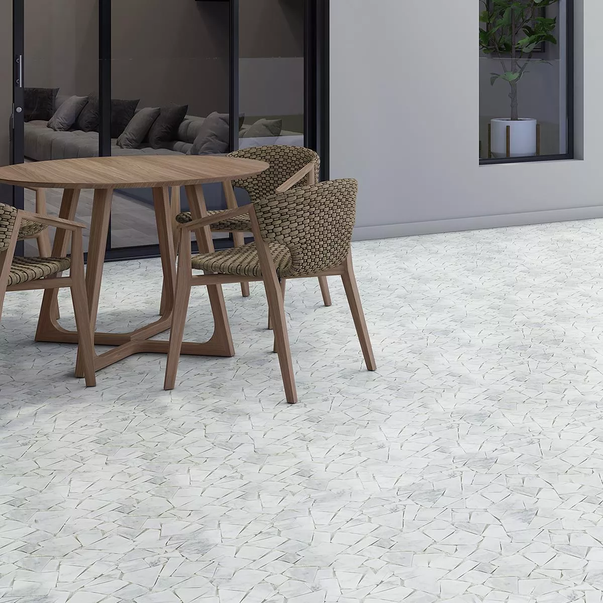 Opplev tidløs eleganse med våre knuste marmormosaikkfliser Mareblu Carrara White. Disse mosaikk-, vegg- og gulvflisene med variable steinstørrelser fra 15-69 mm gir dine innendørs og utendørs områder et luksuriøst utseende. Den matte finishen og frostbestandigheten gjør dem ideelle for våte områder.