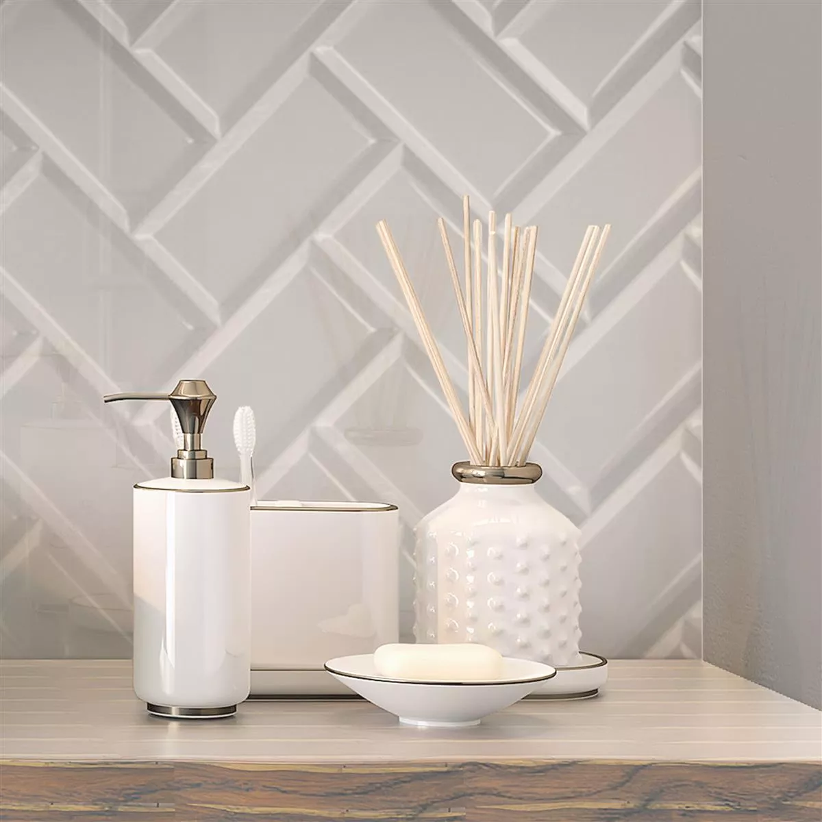 Metro veggflisene «Heliopolis Facette White» kombinerer tidløs eleganse med et snev av retrosjarm. Hver pakke (1m²) består av 88 glaserte steintøyfliser i rektangulært format (7,5x15cm), som imponerer med en skinnende overflate og mangefasettert design.