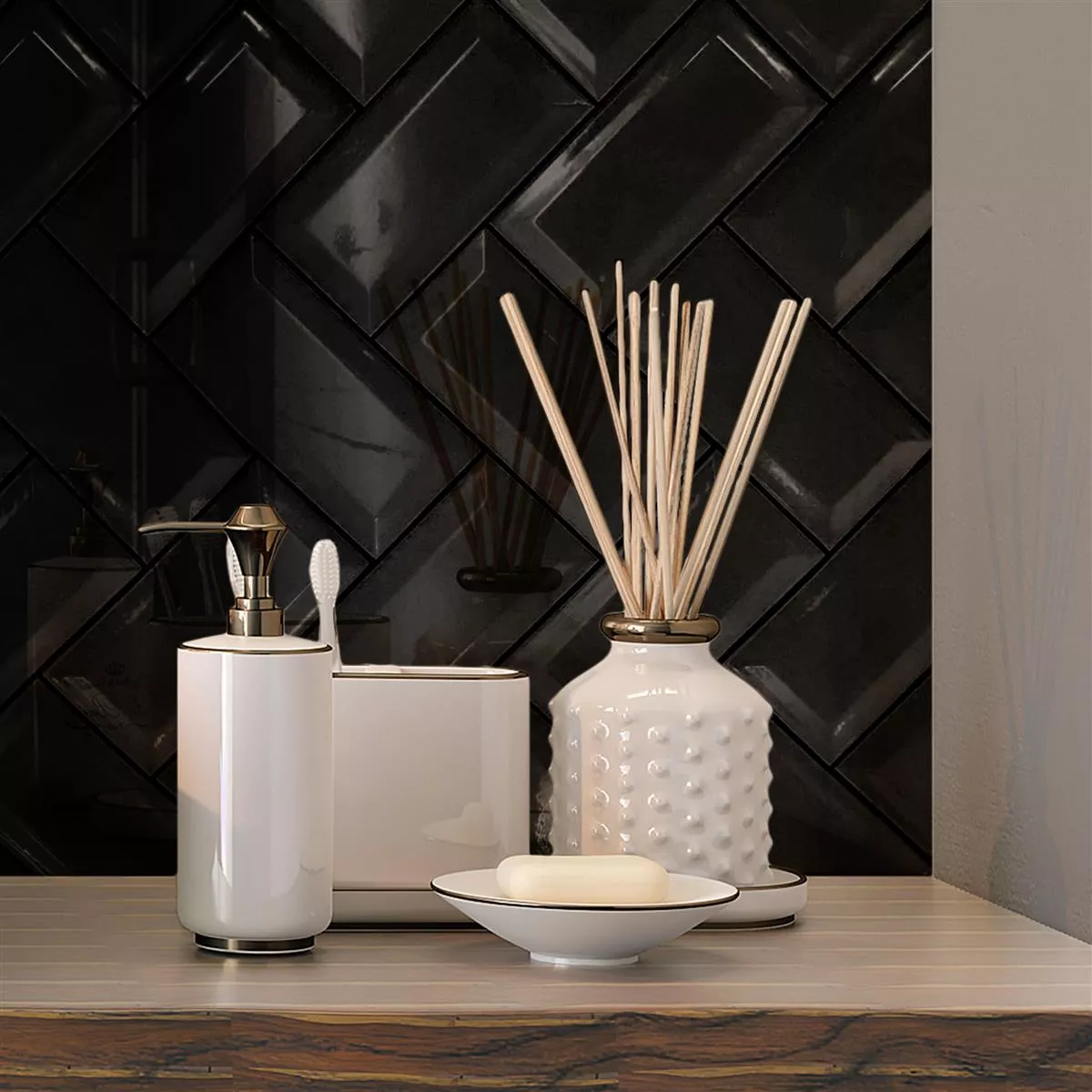 Metro veggflisene "Heliopolis Facette Black" bringer sjarmen til klassisk eleganse inn i hjemmet ditt. Pakken på 1m² inneholder 88 glaserte, ikke-korrigerte steintøyfliser i rektangulært format (7,5x15cm), som imponerer med en blank overflate og en tykkelse på 10mm.