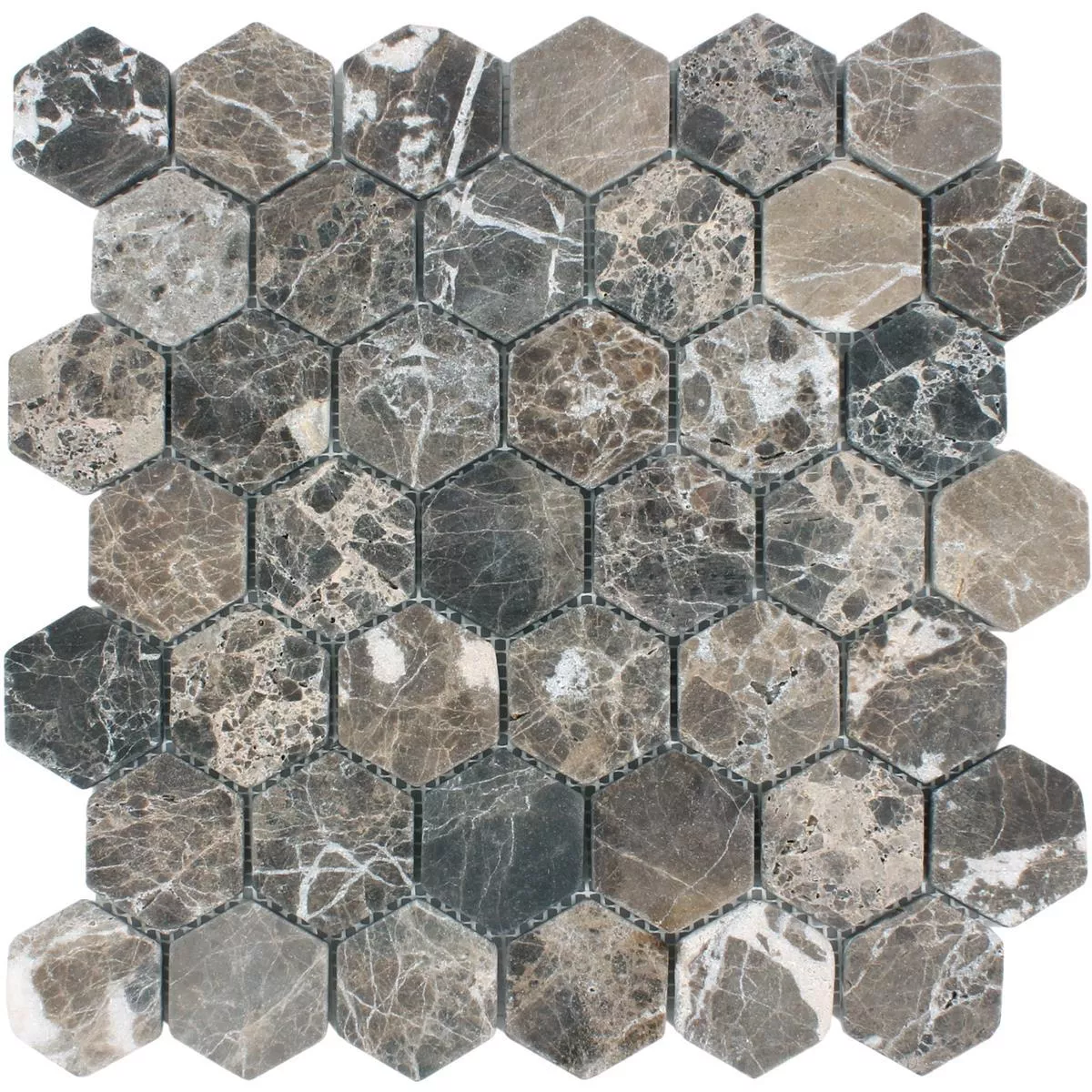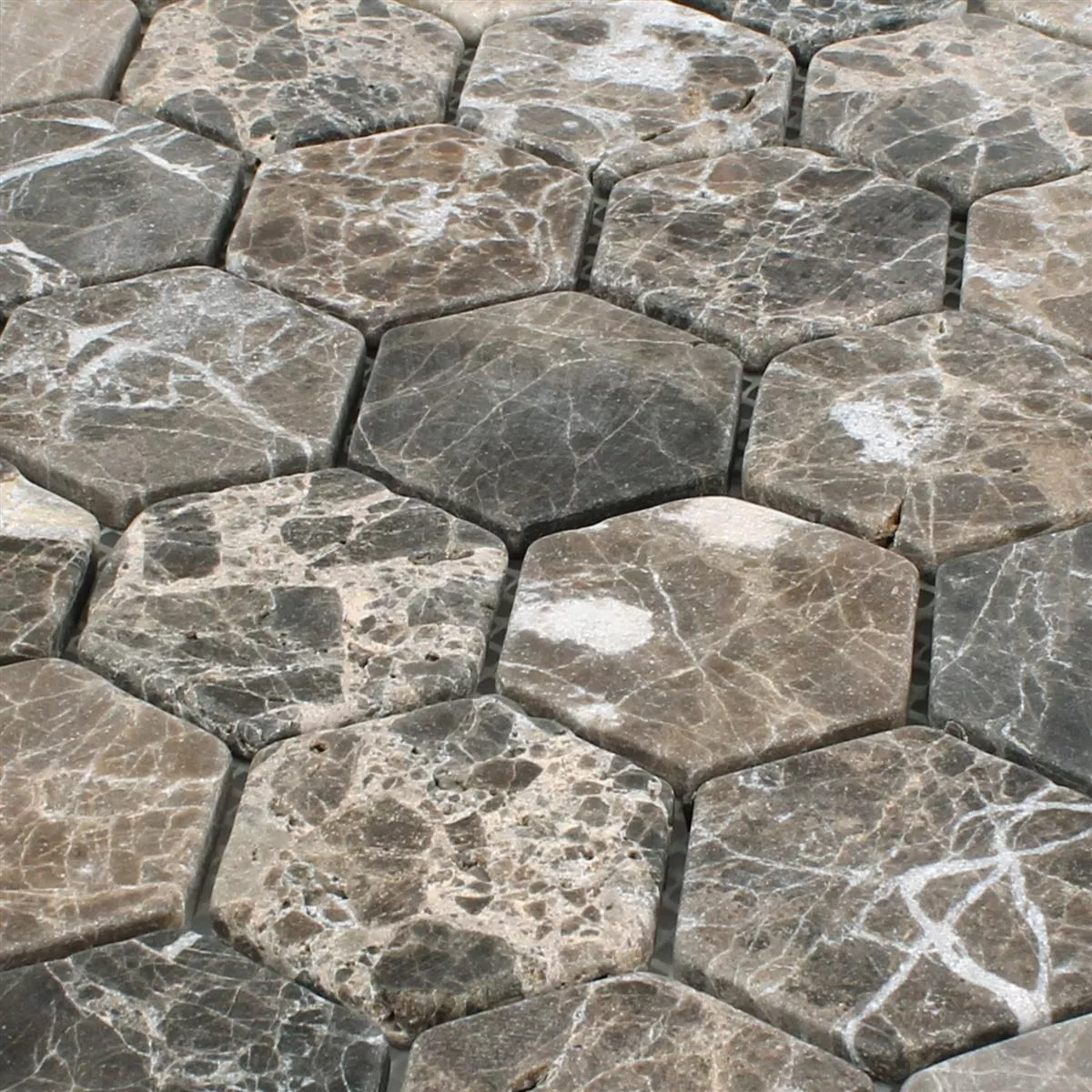 Mosaikken til denne Tarsus Emprador natursteinflisen består av sekskantformede marmorsteiner. De er tilgjengelige i fire forskjellige overflatemønstre som enkelt kan kombineres med hverandre. Dette åpner for designmuligheter som gir leiligheten din et veldig personlig preg.