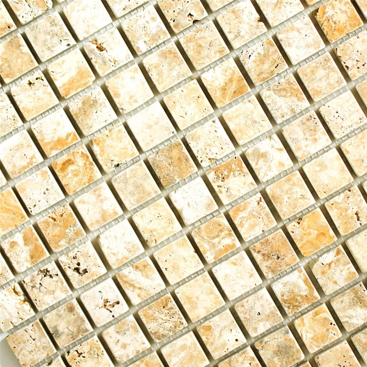 Travertine Castello Gold 23 mosaikkfliser er et naturprodukt. Travertin, steinen fra Tivoli, har en spesielt maritim sjarm og dens porøse overflate gjør dette naturproduktet så attraktivt. Disse flisene kalt Travertine Gold har også et visst gyllent skimmer i den vakre fargeskalaen. Dette er naturfliser som også fremstår som naturlige og har en livlig overflate.