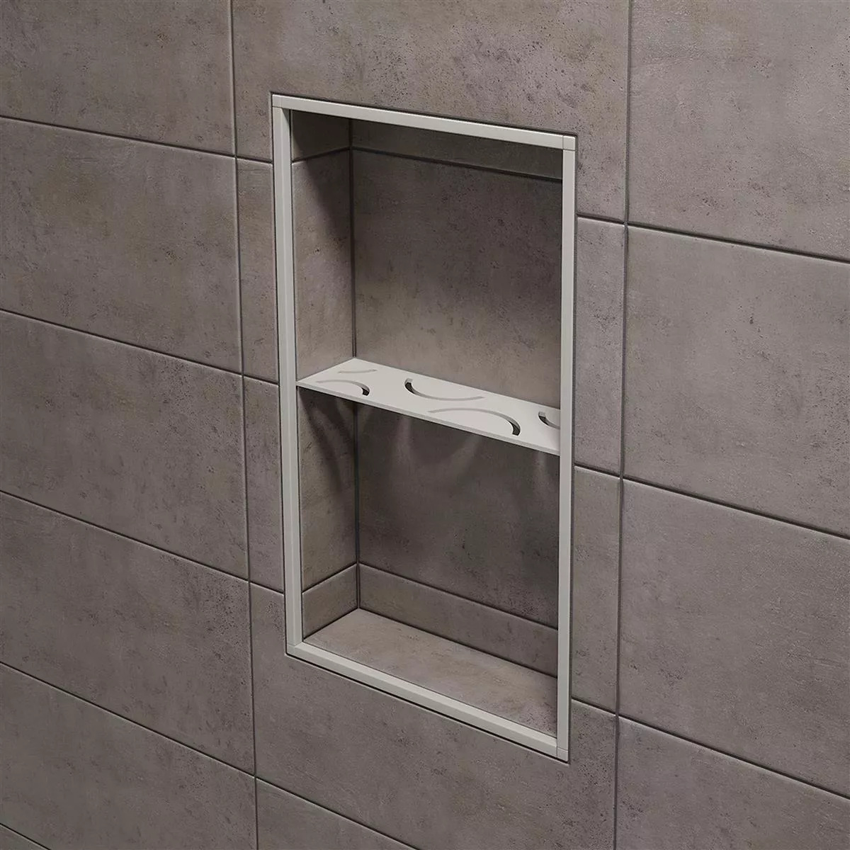 Schlüter-SHELF-N-S1 Beige Rektangulær nisjevegghylle Med Schlüter-SHELF-N-S1 kan du utstyre den prefabrikkerte Schlüter-KERDI-BOARD-nisjen med en nøyaktig passende hylle mens du legger flisene. Det er ikke alt: Du har også maksimal fleksibilitet når det gjelder materiale og design. Nisjevegghyllen av høy kvalitet er laget av enten børstet rustfritt stål eller teksturbelagt aluminium.
