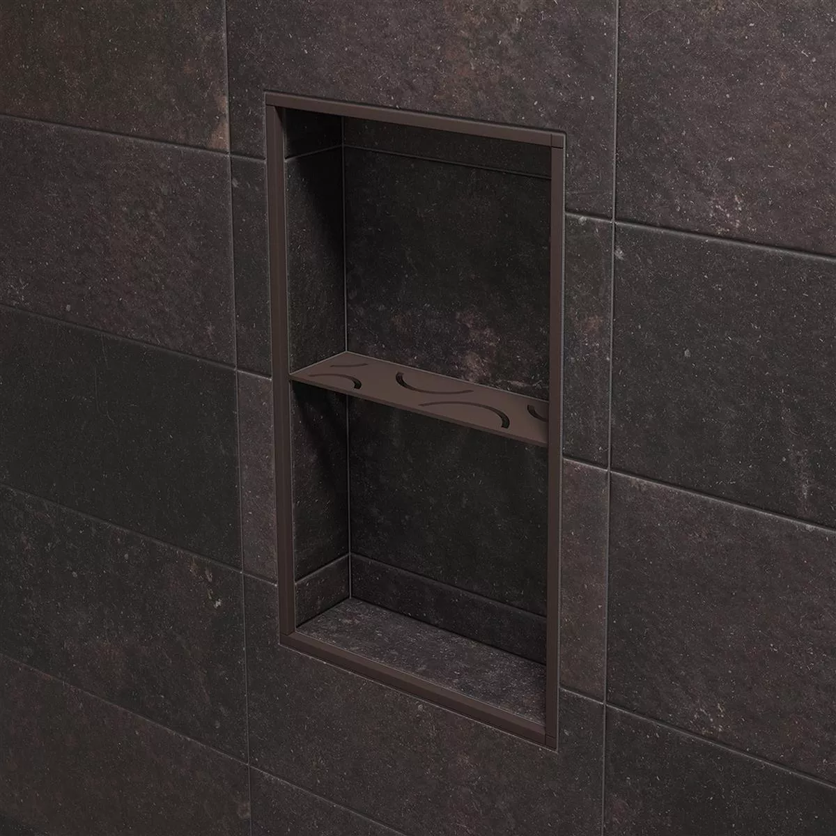 Schlüter-SHELF-N-S1 Bronse Rektangulær nisjevegghylle Med Schlüter-SHELF-N-S1 kan du utstyre den prefabrikkerte Schlüter-KERDI-BOARD-nisjen med en nøyaktig passende hylle mens du legger fliser. Det er ikke alt: Du har også maksimal fleksibilitet når det gjelder materiale og design. Nisjevegghyllen av høy kvalitet er laget av enten børstet rustfritt stål eller teksturbelagt aluminium.