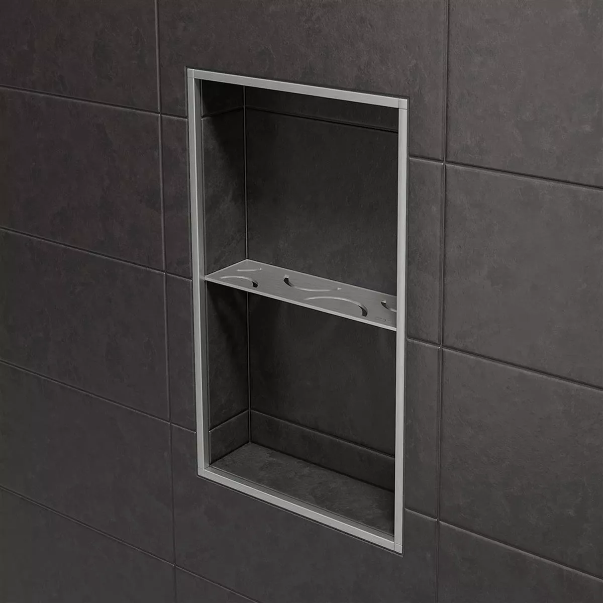 Schlüter-SHELF-N-S1 Sølv Rektangulær nisjevegghylle Med Schlüter-SHELF-N-S1 kan du utstyre den prefabrikkerte Schlüter-KERDI-BOARD-nisjen med en nøyaktig passende hylle mens du legger fliser. Det er ikke alt: Du har også maksimal fleksibilitet når det gjelder materiale og design. Nisjevegghyllen av høy kvalitet er laget av enten børstet rustfritt stål eller teksturbelagt aluminium.