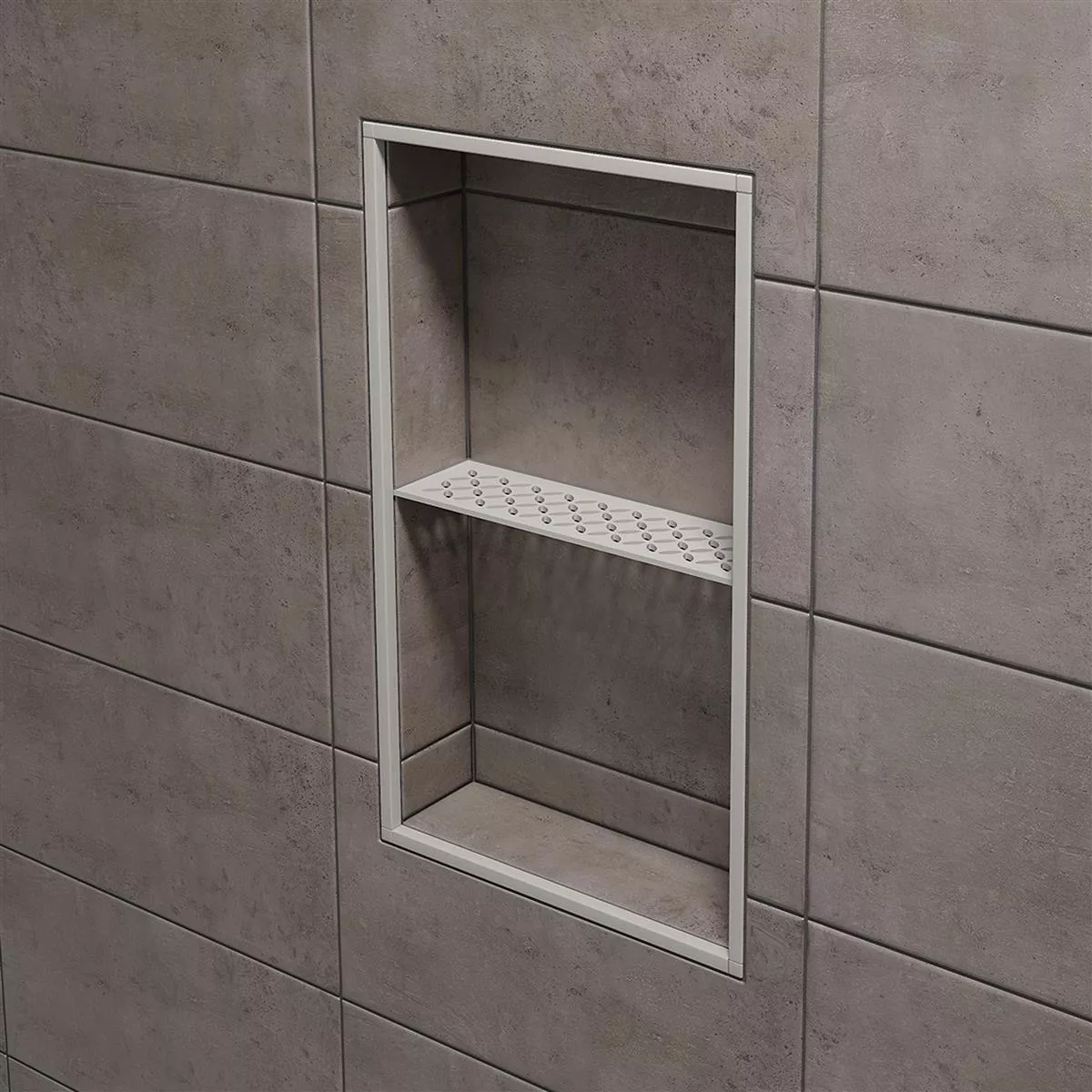 Schlüter-SHELF-N-S1 Beige Rektangulær Nisje Vegghylle. Med Schlüter-SHELF-N-S1 kan du utstyre den prefabrikkerte Schlüter-KERDI-BOARD nisjen med en perfekt passende hylle under flisleggingen. Men det er ikke alt: du har også maksimal fleksibilitet når det gjelder materiale og design. Denne høykvalitets nisjevegghyllen er tilgjengelig i enten børstet rustfritt stål eller teksturert lakkert aluminium.