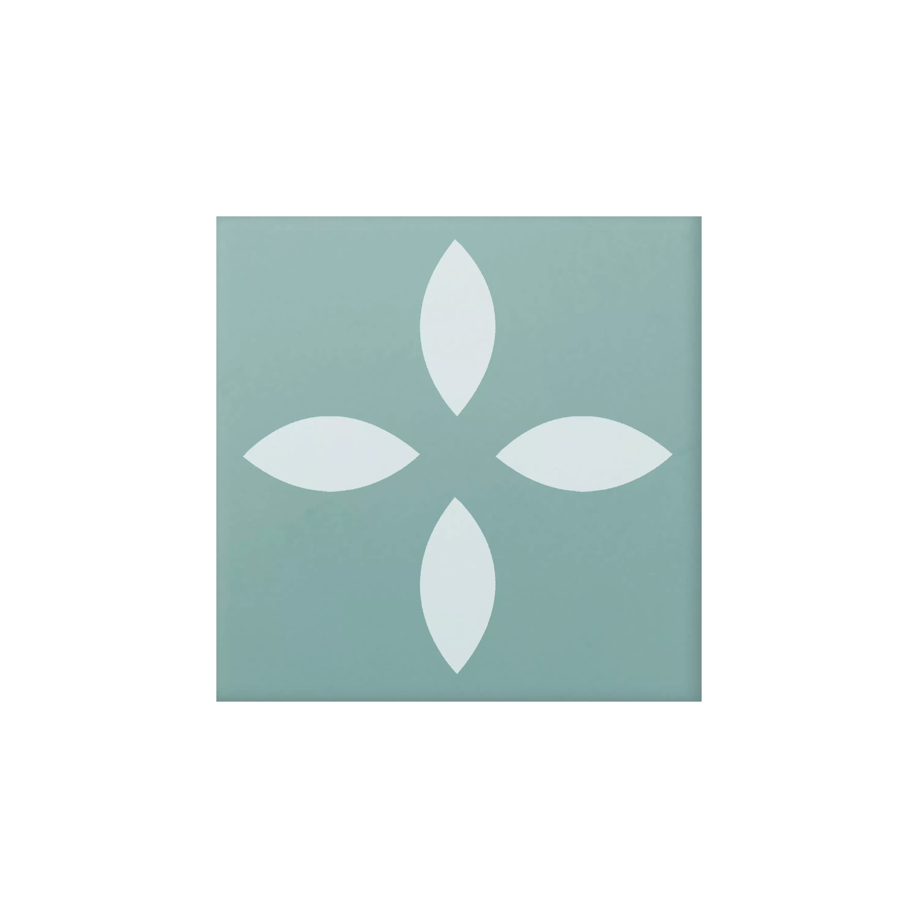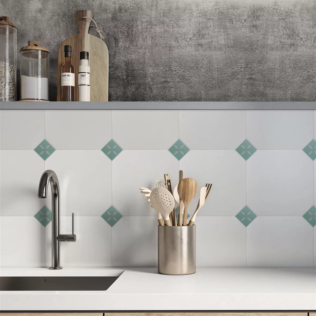 Die Feinsteinzeug Fliesen Genexia Decor Türkis Einleger bringen frische Farbakzente und einen Hauch von Retro-Charme in Ihr Zuhause. Mit ihrer quadratischen Form und der matten Oberfläche eignen sie sich ideal für den Innenbereich, Wohnräume, Nassbereiche wie Bad und Dusche sowie die Küche.