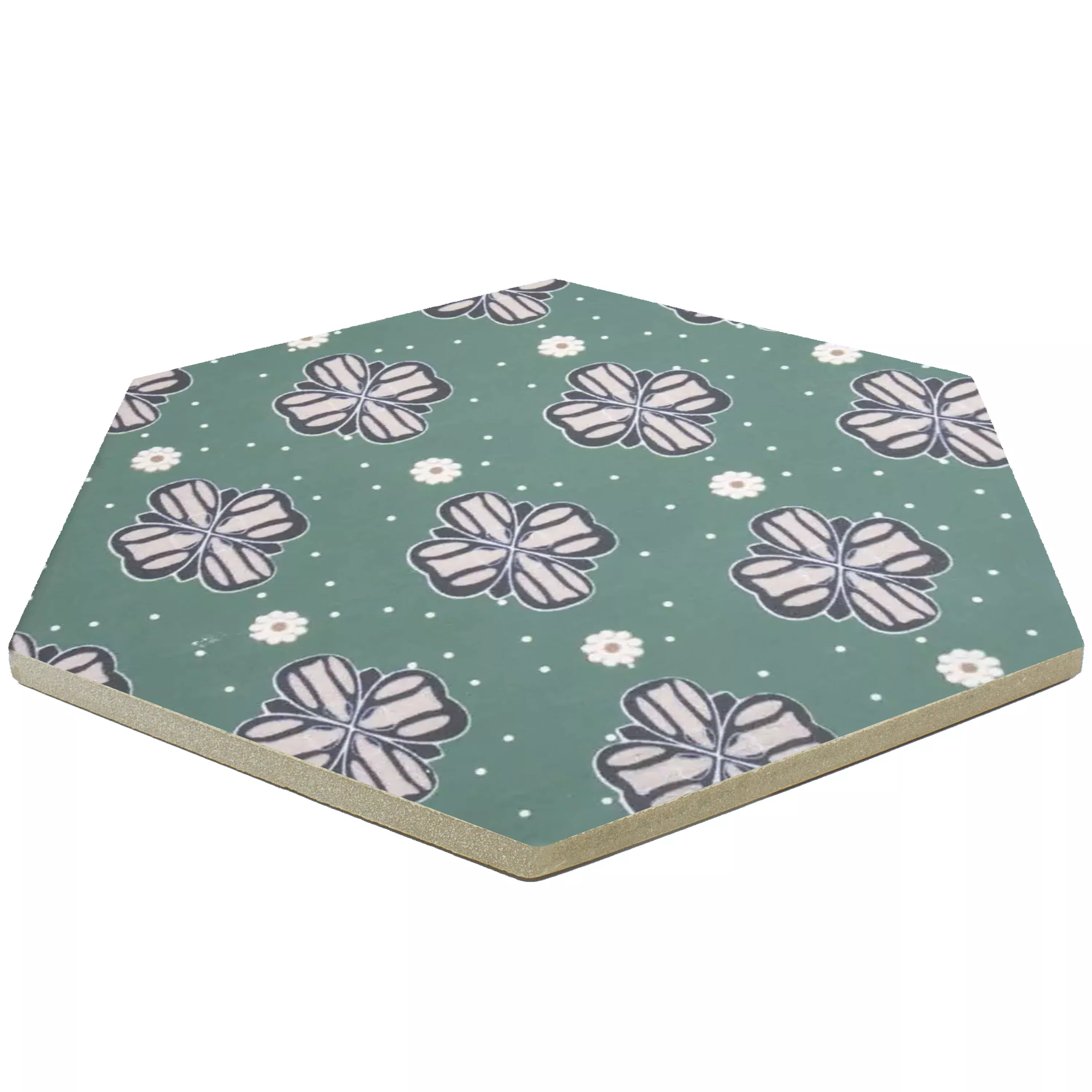 "Modena Hexagon Decor 7" porselenssteintøyfliser kombinerer imponerende design med høy funksjonalitet. Med en tykkelse på 10 mm er de perfekte for våtrom, dusjer, bad, kjøkken, stuer og innendørs områder. Den matte overflaten, i en attraktiv grønn med blomsterdekorasjoner, gir flisene et tidløst elegant utseende.
