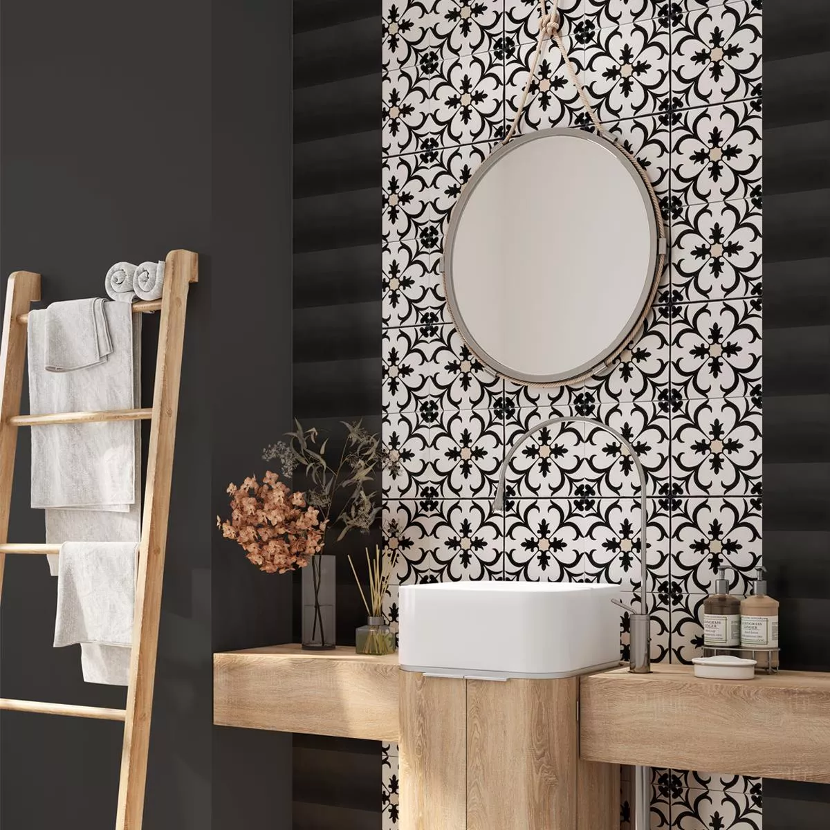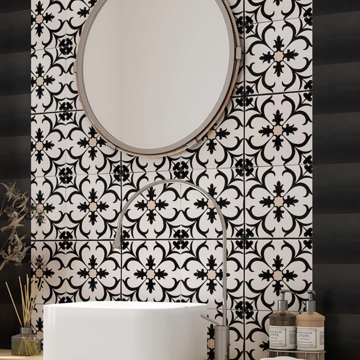 Ta med luksusen og holdbarheten du fortjener inn i hjemmet ditt med våre Ornamenti Black porselenssteintøyfliser.