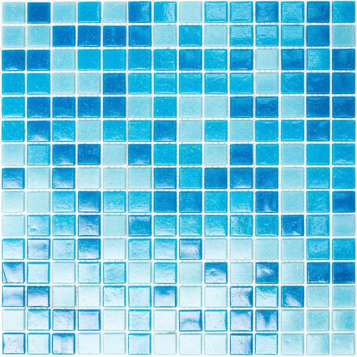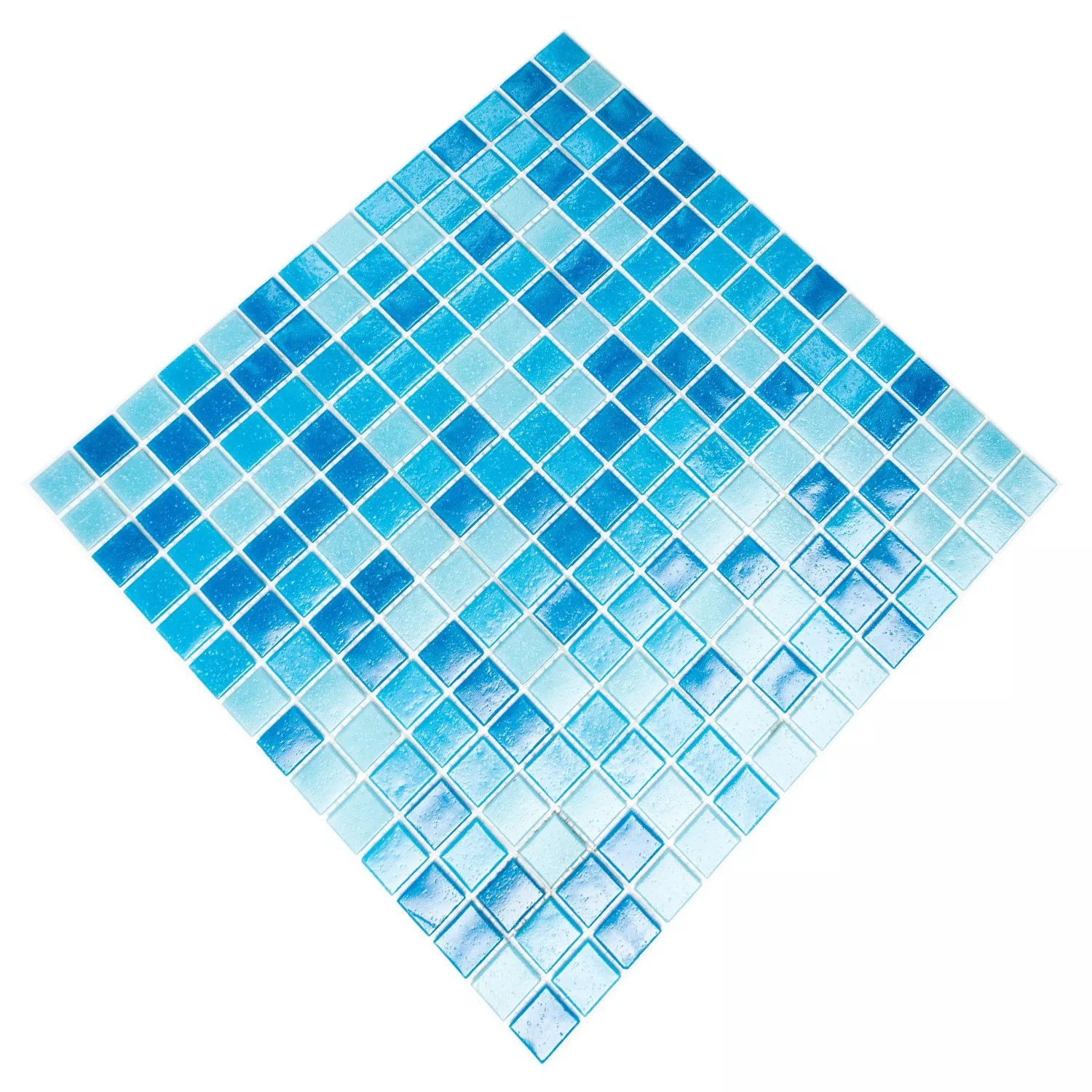 Blå mosaikkfliser for innendørs eller utendørs svømmebasseng. Papirliming gjør skjæringen lettere for håndverkeren. De kan rengjøres raskt ved hjelp av glassoverflaten.-