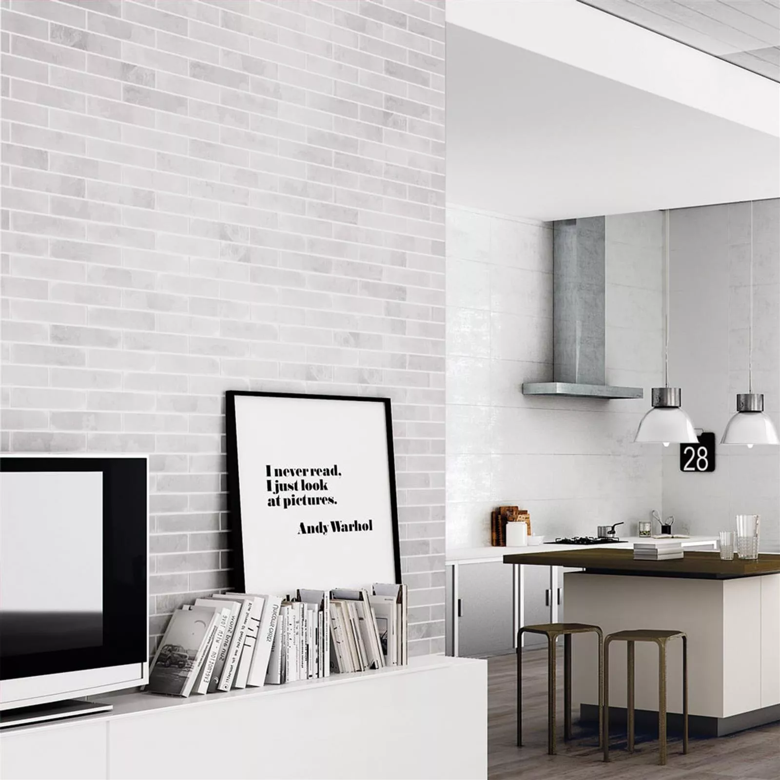 Herzog veggflisen i hvit er laget av steintøy og måler 7x28cm. Flisene har en naturlig kant. De langstrakte veggflisene er dekket i de perfekte fargene. Overflatene på de rektangulære veggflisene er matte.