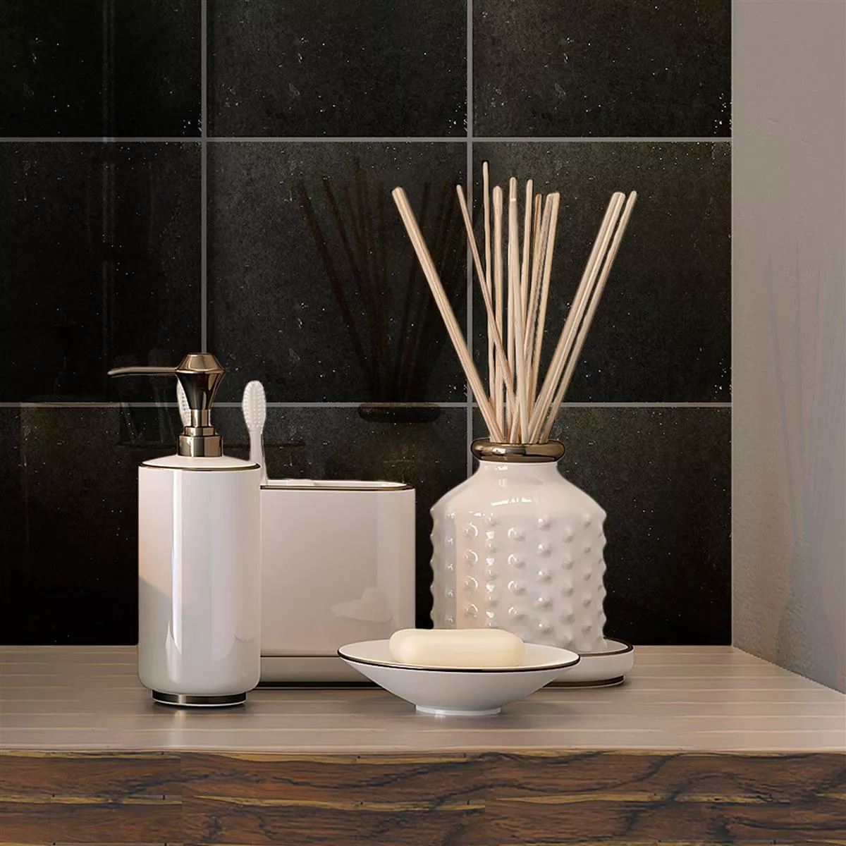 Med en tykkelse på 9 mm og et kvadratisk format på 15x15 cm passer flisen perfekt inn i interiører som bad, kjøkken, stue eller dusj. Takket være sin egnethet for våtrom er den spesielt egnet for fuktige miljøer og gir disse rommene en elegant og atmosfærisk atmosfære.