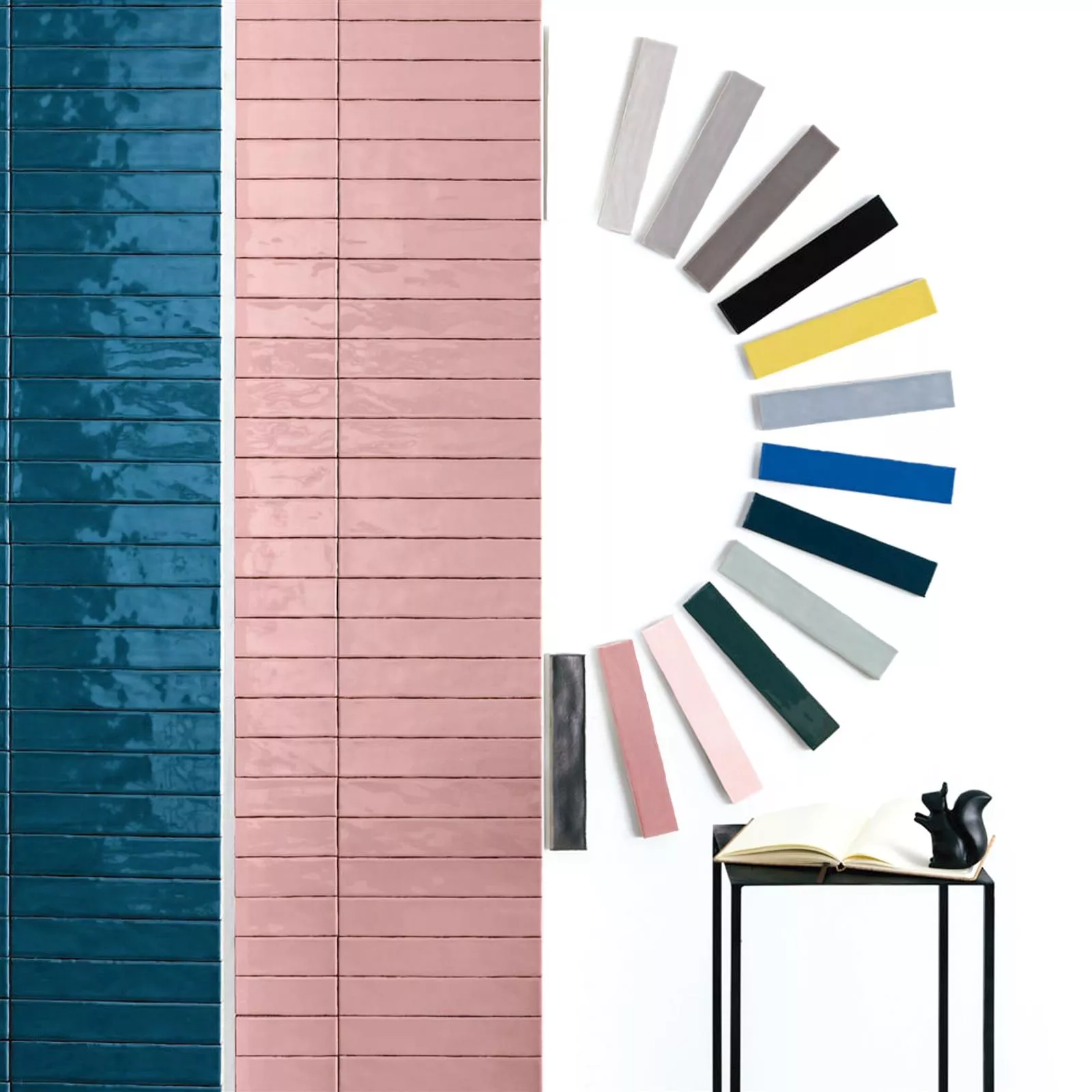 Montreal veggfliser i ulike farger, med en bølget, glasert overflate laget av steintøy. Skinnende overflate med naturlig kant.