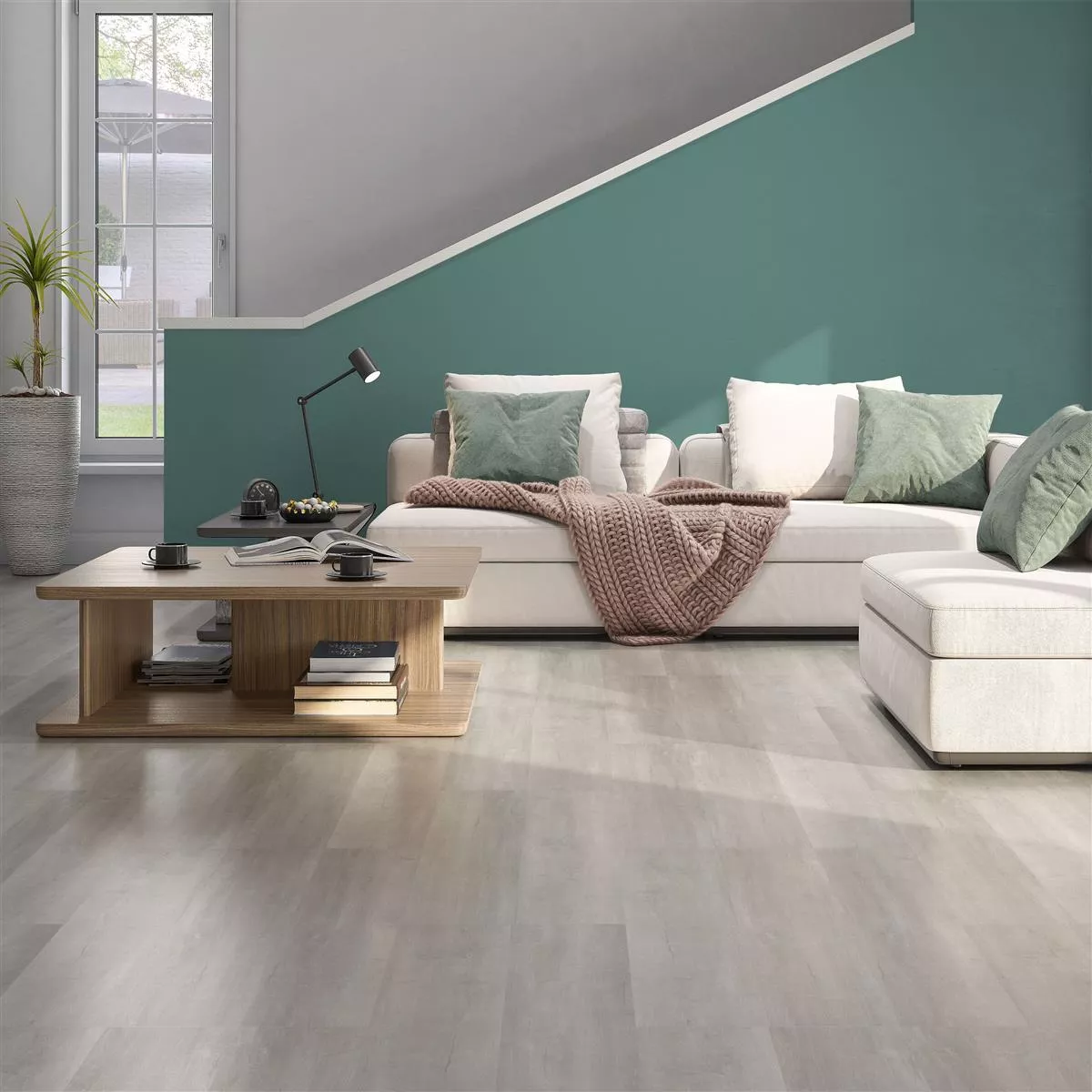 Fargen lysegrå gir gulvet et moderne og tidløst utseende som passer til mange interiørstiler. Gulvet er 5 mm tykt og er laget av vinyl, et materiale som kjennetegnes ved sin robusthet og holdbarhet. Med en pakkestørrelse på 2,17 m² kan gulvet legges raskt og enkelt.