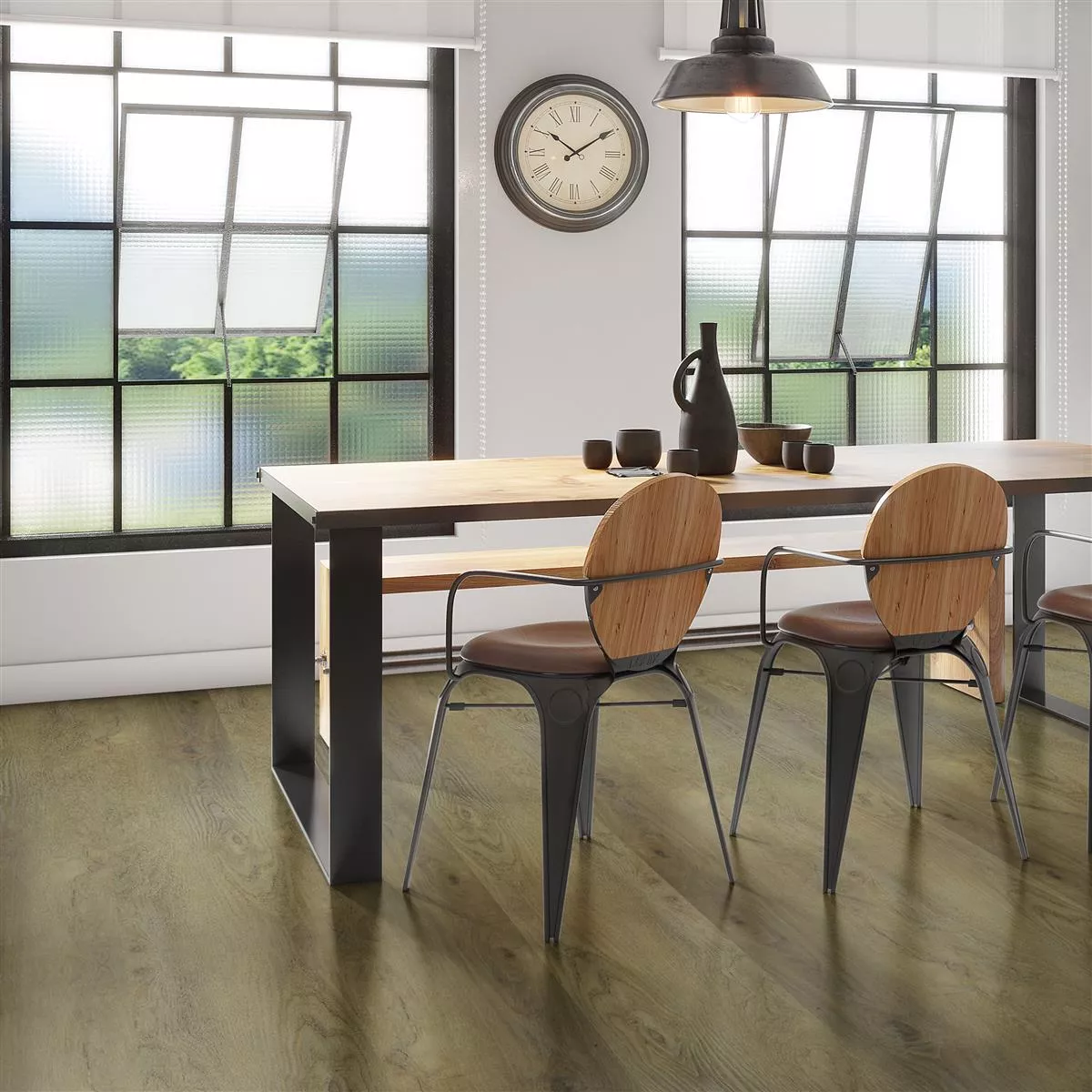 Hollywood klikksystem vinylgulv i en sofistikert taupe-tone gir rommene et elegant og tidløst moderne utseende. Dette høykvalitetsgulvet kombinerer et attraktivt treutseende med moderne komfort for å skape en innbydende atmosfære.